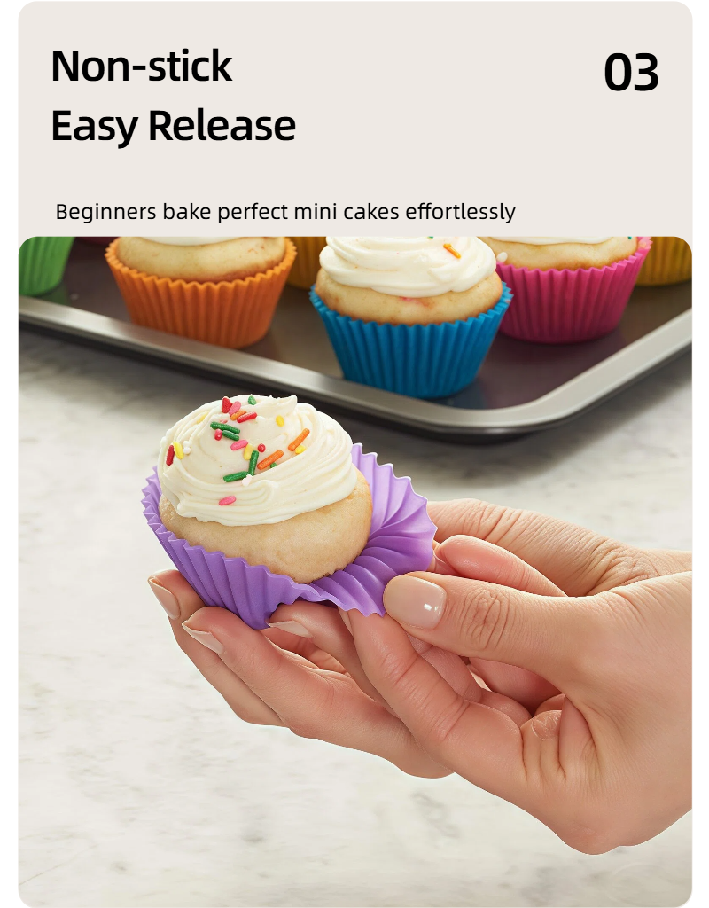 Introducing our premium food-grade silicone cake cups, the ultimate upgrade for your home baking and party preparations. Crafted with FDA & LFGB certified silicone material, these reusable muffin molds ensure zero risk of harmful substances leaching, making them 100% safe for kids, babies, and the entire family—perfect for preparing baby food, healthy snacks, and delicious desserts. Featuring a non-stick surface, they allow for effortless pop-out release, so even baking beginners can easily create round, plump cakes, muffins, puddings, and more without any mess or broken treats. Designed to be heat-resistant from -40℃ to 230℃, they are compatible with most home oven pans and baking sheets, eliminating the need for extra molds and saving your kitchen space. Available in a variety of vibrant colors and multiple sizes, our silicone cake cups not only add a touch of fun to your baking but also serve as versatile kitchen essentials for portioning, storing leftovers, and decorating dessert tables for birthdays, parties, or parent-child baking activities. As an eco-friendly alternative to disposable paper cups, they can be reused thousands of times, helping you reduce plastic waste while cutting down on long-term baking costs. Cleaning is a breeze too—simply rinse with water or put them in the dishwasher for a hassle-free cleanup. Whether you’re a seasoned baker, a busy parent, or someone who loves hosting small gatherings, these silicone cake cups combine safety, convenience, and style to elevate your baking experience. Choose our reusable silicone muffin cups and enjoy the joy of baking with peace of mind!