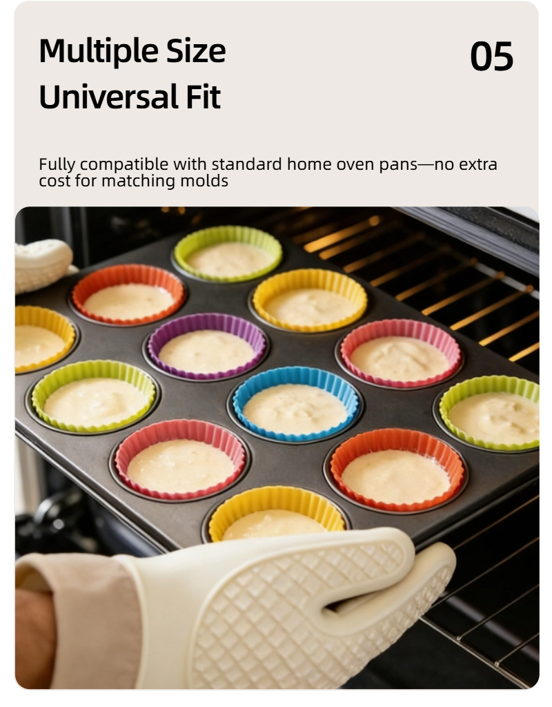 Reusable silicone muffin cups – food-grade material, safe for kids & family. Non-stick release, versatile for cakes, puddings & storage. Multiple colors/sizes available. Ideal for parent-child baking!