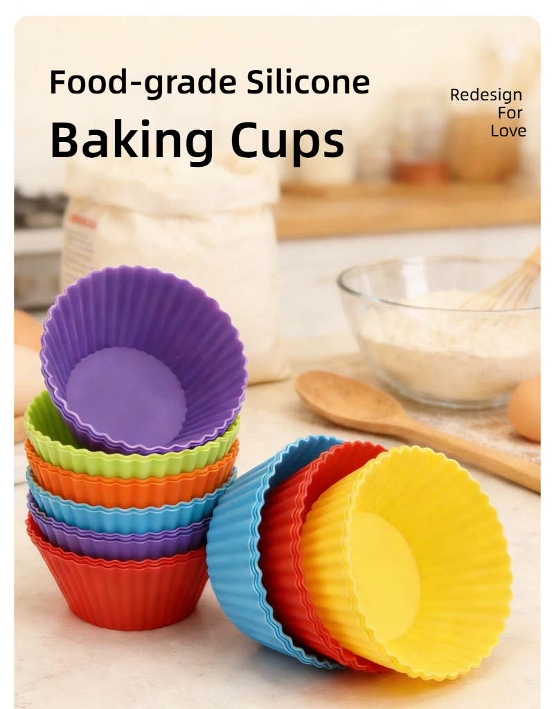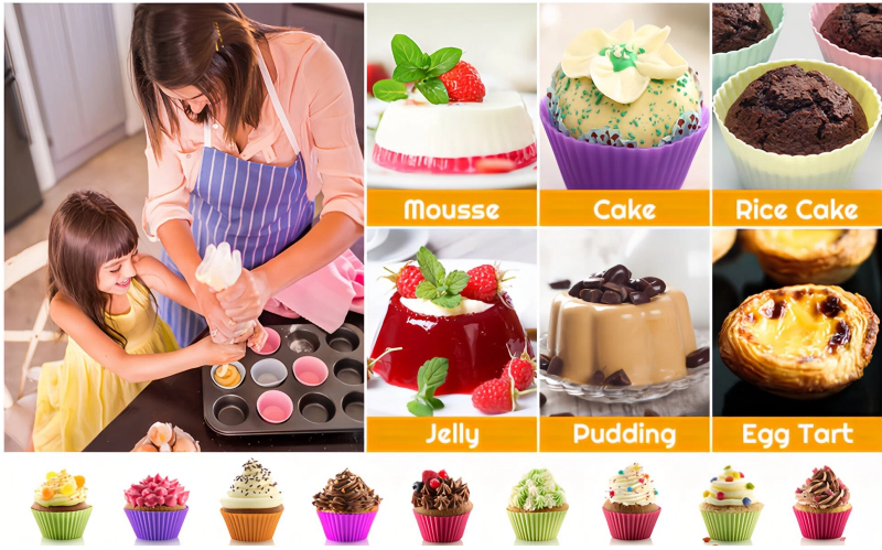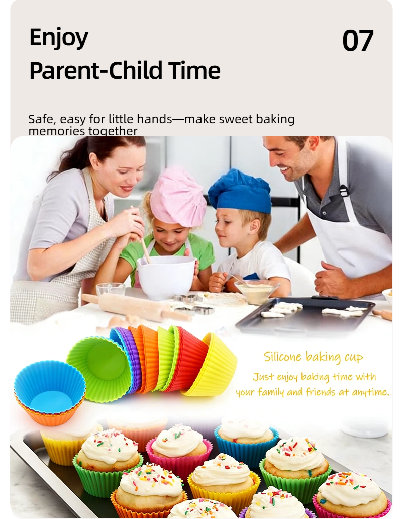 Reusable silicone muffin cups – food-grade material, safe for kids & family. Non-stick release, versatile for cakes, puddings & storage. Multiple colors/sizes available. Ideal for parent-child baking!