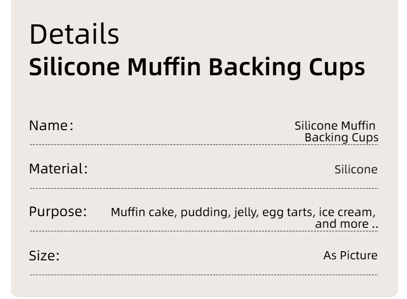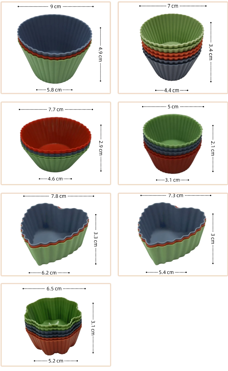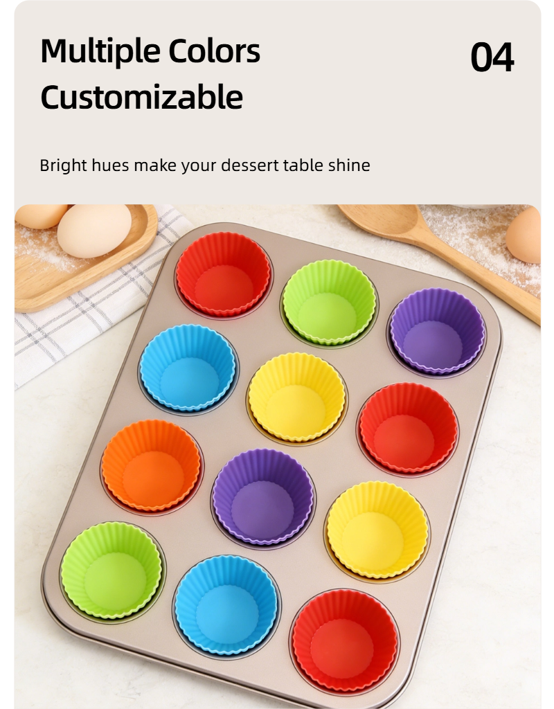 Introducing our premium food-grade silicone cake cups, the ultimate upgrade for your home baking and party preparations. Crafted with FDA & LFGB certified silicone material, these reusable muffin molds ensure zero risk of harmful substances leaching, making them 100% safe for kids, babies, and the entire family—perfect for preparing baby food, healthy snacks, and delicious desserts. Featuring a non-stick surface, they allow for effortless pop-out release, so even baking beginners can easily create round, plump cakes, muffins, puddings, and more without any mess or broken treats. Designed to be heat-resistant from -40℃ to 230℃, they are compatible with most home oven pans and baking sheets, eliminating the need for extra molds and saving your kitchen space. Available in a variety of vibrant colors and multiple sizes, our silicone cake cups not only add a touch of fun to your baking but also serve as versatile kitchen essentials for portioning, storing leftovers, and decorating dessert tables for birthdays, parties, or parent-child baking activities. As an eco-friendly alternative to disposable paper cups, they can be reused thousands of times, helping you reduce plastic waste while cutting down on long-term baking costs. Cleaning is a breeze too—simply rinse with water or put them in the dishwasher for a hassle-free cleanup. Whether you’re a seasoned baker, a busy parent, or someone who loves hosting small gatherings, these silicone cake cups combine safety, convenience, and style to elevate your baking experience. Choose our reusable silicone muffin cups and enjoy the joy of baking with peace of mind!